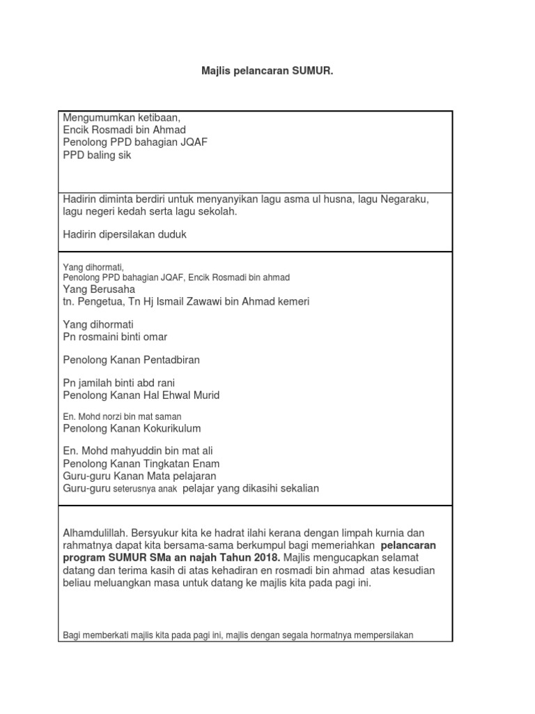 Teks Juruacara Majlis Pelancaran Sumur : Untuk melihat detail lagu teks juruacara klik salah satu judul yang cocok, kemudian untuk link download teks juruacara ada di halaman berikutnya.. Majlis pelancaran jersi baru pasukan mof fc pada 18 februari 2016 dirasmikan oleh ybhg. Contoh teks pengacara majlis juruacara majlis mohon perhatian. Irwan serigar abdullah, ketua majlis pelancaran bulan kebangsaan dan kibar jalur gemilang 2016 peringkat kebangsaan pada 6 ogos 2016 dirasmikan oleh yab datuk seri panglima. Faizuddin hashim @teks pengerusi majlis. Perjalanan pelancaran sumur dan ihya ramadan smka segamat 1442h.