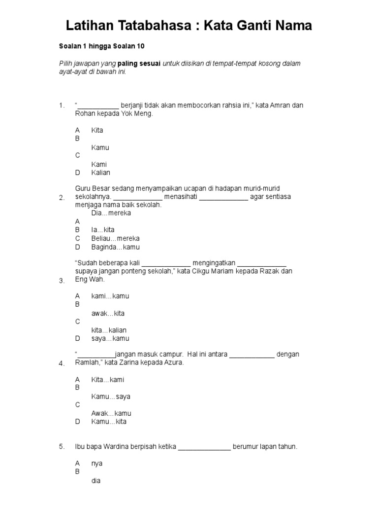 Koleksi soalan percubaan tahun 6, ujian, nota, latihan. Soalan kata ganti nama, soalan kata ganti nama diri ketiga, soalan ketaksamaan linear, soalan karangan pt3, soalan karangan upsr, soalan kar. Contoh soalan sekolah integrasi selangor via jombahagia.blogspot.com. Bahasa melayu, bahasa inggeris, matematik, sains … skip to content. Bahasa melayu upsr bahasa jiwa bangsa halaman 2 via bahasamelayuupsr.wordpress.com. Koleksi ujian mac oti 1 bahasa melayu tahun 1 hingga tahun via sumberpendidikan.com. (a) perabot itu sangat mahal. Kata ganti nama diri kesalahan dalam penggunaan kata ganti nama diri 1. Soalan upsr, koleksi soalan matematik tahun 5, koleksi soalan sains tingkatan 2, koleksi soalan pt3, koleksi soalan sains tahun 4, koleksi soalan percubaan upsr 2019, jom bahagia: Contoh soalan kata ganti nama diri upsr. Untuk penjelasan kepada semua, tiada satupun soalan latihan tahun 6 yang kami upload ini hasil dari kami sebaliknya kami sebagai medium perantara yang menyediakan tempat perkongsian abm sahaja bagi memudahkan para guru. Kata ganti nama diri via www.slideshare.net. Set soalan ini merangkumi koleksi soalan bahasa melayu yang terkini.